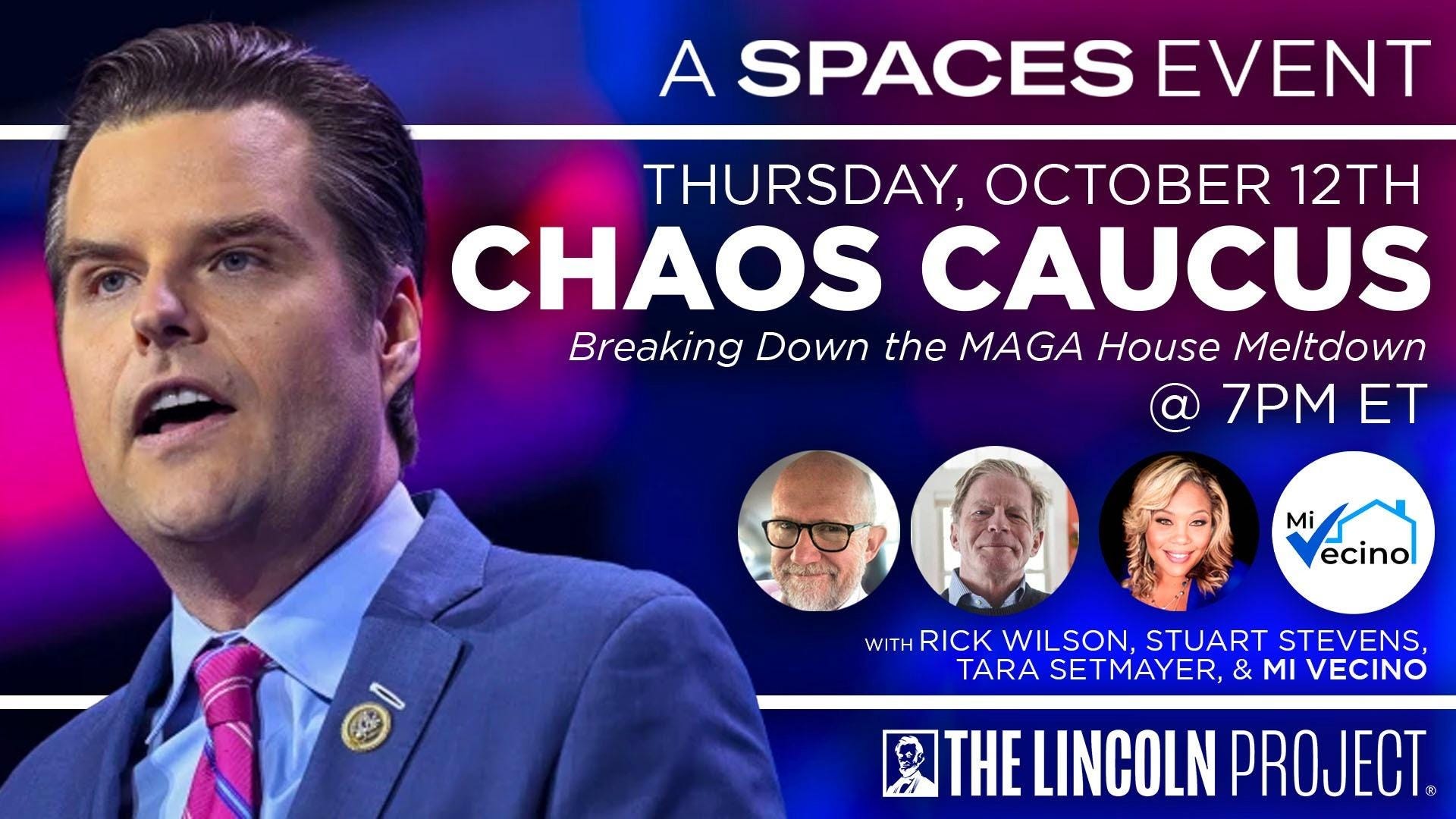 I hope you’ll join me, the Lincoln Project team, and some special guests in a Twitter Spaces event tomorrow night at 7pm ET where we break down the Chaos Caucus and how it’s wrecking the House Republicans.