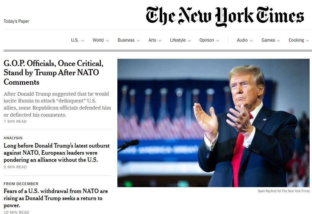 To their credit, the New York Times is paying attention to the vastly more consequential story of Trump’s pro-Russia, anti-NATO ranting than last week’s Special Counsel attack on President Biden — and make no mistake, it wasn’t just an attack, it was a job application for Robert Hur for Attorney General in a second Donald Trump Administration.