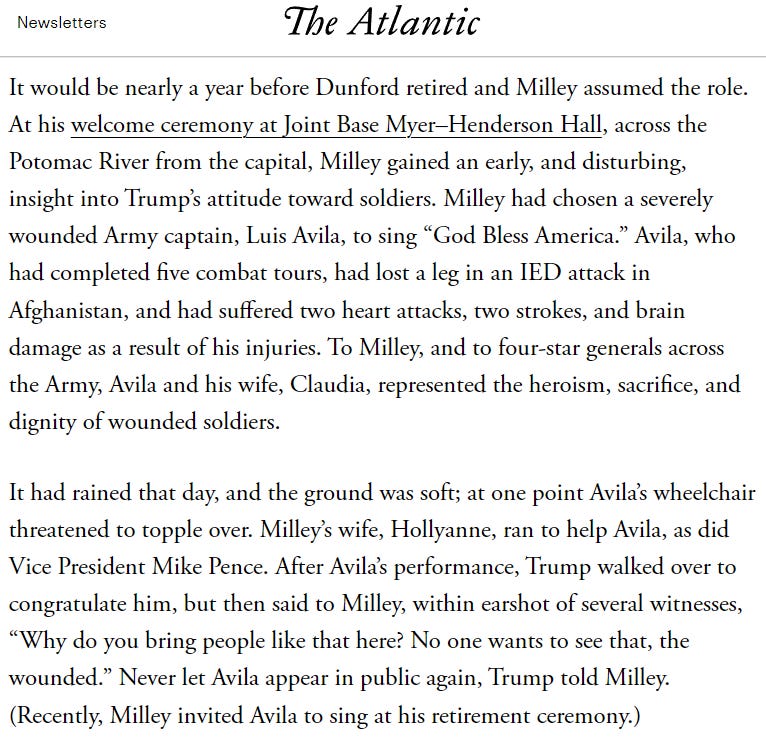 In the new Atlantic profile of General Mark Milley by the always excellent Jeffrey Goldberg, retiring Chairman of the Joint Chiefs of Staff, an anecdote on Trump’s character once again shows just how depraved the former President really is.