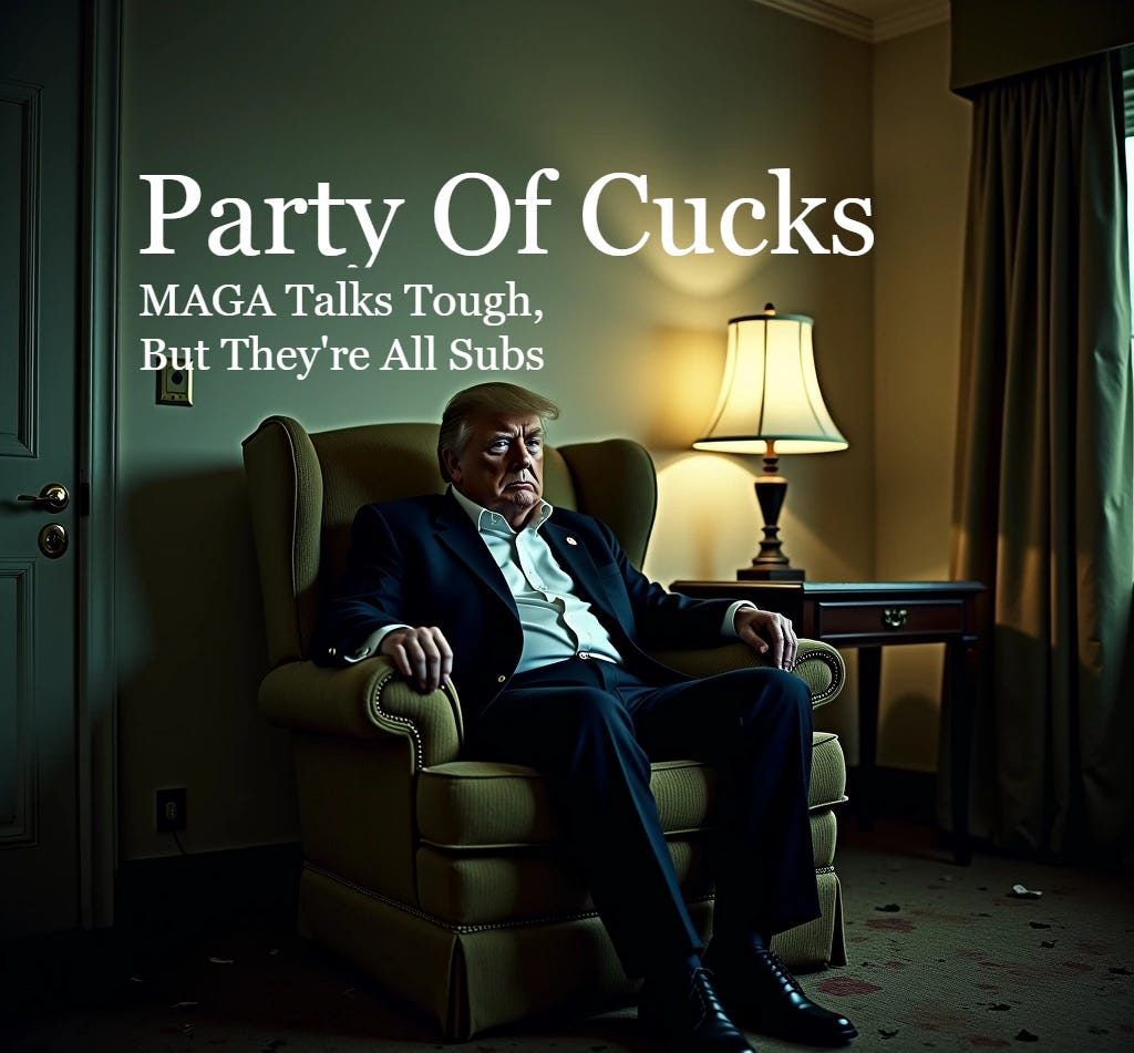In reality, it’s the Party of Cucks, a whimpering harem of weak men who mistake submission for strength and degradation for loyalty. They don’t fight. They kneel. They don’t resist. They beg. They’re not the party of dark suits and cold eyes; they’re gimps, begging for pain.