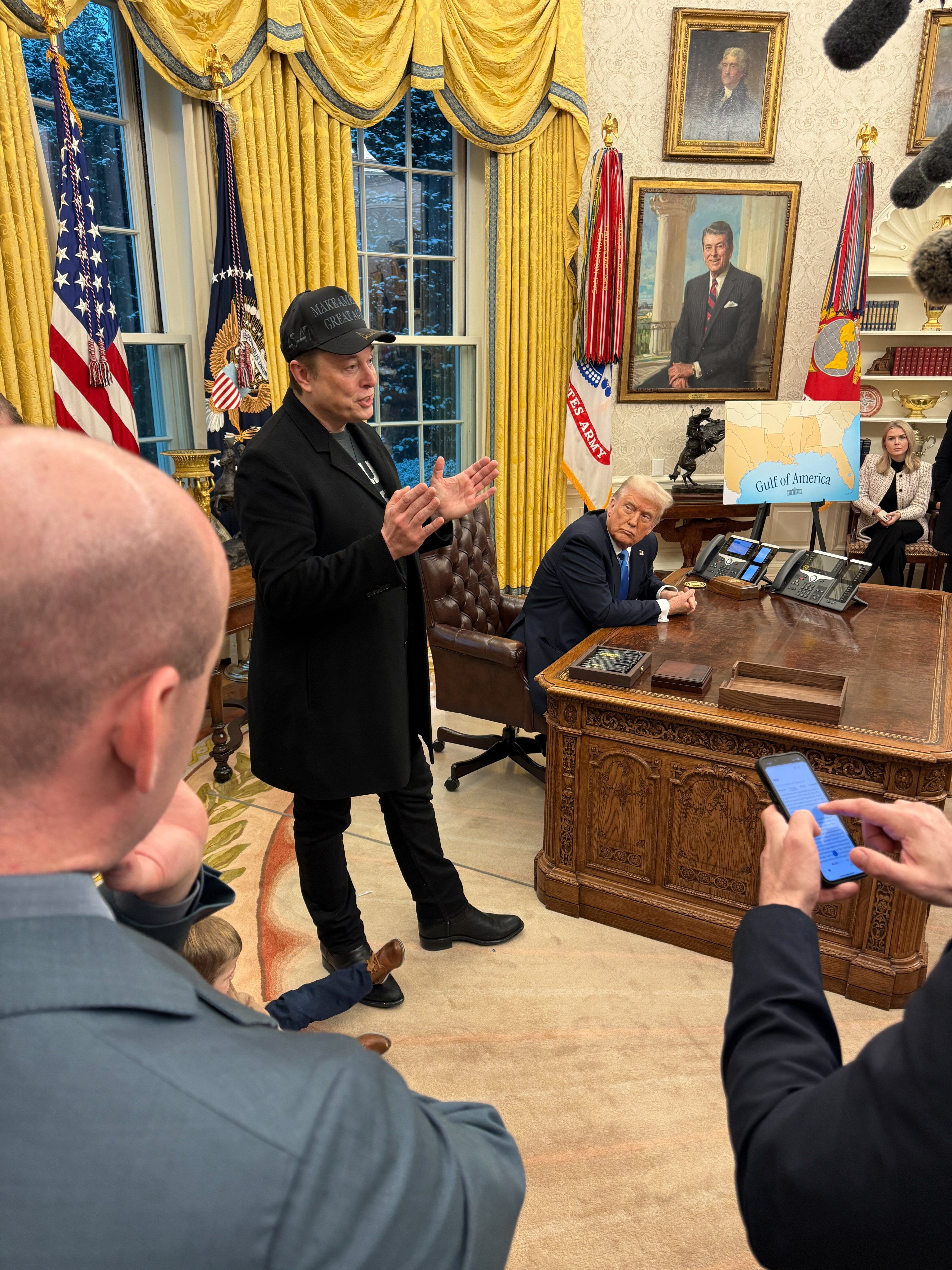 A picture really does speak louder than words, and yesterday’s Oval Office briefing by President Elon Musk proved it in spades. There he was, in the most exclusive office in D.C., simultaneously manhandling the press while having one of his 11 spawn babysat by some poor subordinate. If Michelangelo were around, this tableau would be on the ceiling of the Sistine Chapel—commissioned by a Medici who wanted to show off his power over the Pope