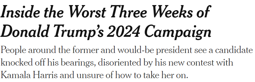 The last three weeks have broken Trump’s already disturbed psyche. He cannot process the political reality that Kamala Harris is more popular, running a better campaign, raising more money, drawing much bigger crowds, moving the polls, and that the culture is swinging her way.