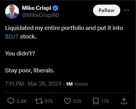 Second, the last two days has seen about an $8 jump in the price of DJT stock, but that isn't the good news that the MAGA commentariat likes to latch on to. What is happening is that the early institutional investors got warrants (essentially options to exercise), and they are converting those into shares ... and *dumping* them immediately. You can see this in a series of bumps, followed by a quick retraction, and a slight trend upward. Also evidenced in the fact that the daily shares exchanges has grown from near 5M, to about 15M. The important thing to note is that this is temporary, and the downward plunge will resume.